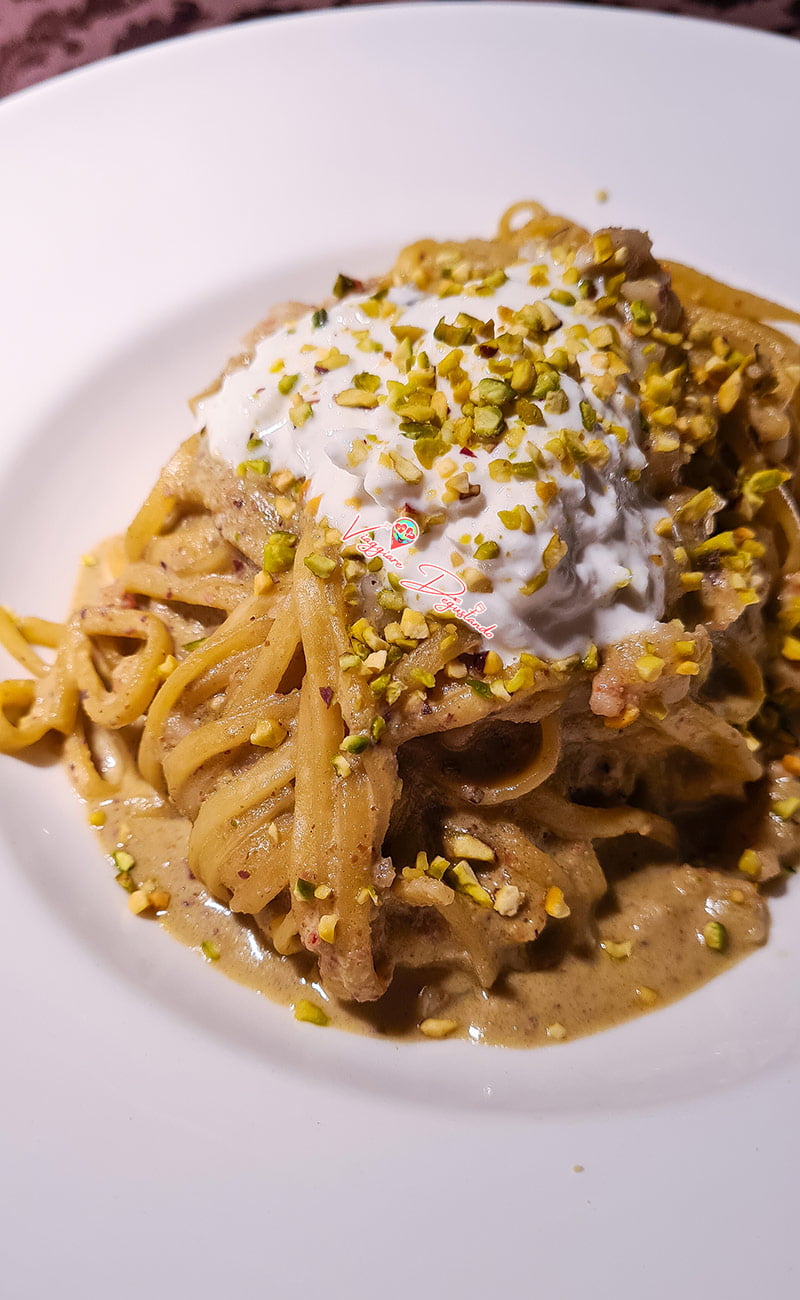 • Tagliolini ai Gamberi e Pistacchio di Bronte con Crema di Stracciatella Campana DOP (17 euro)